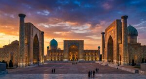 Площадь Регистан — Главная площадь Центральной Азии и архитектурный шедевр XV–XVII веков. Вы увидите три знаменитые медресе — Улугбека, Шер-Дор и Тилля-Кари, узнаете о развитии науки, религии и искусства в эпоху Тимуридов. Мавзолей Гур-Эмир — Усыпальница великого полководца Амир Темура (Тамерлана). Монументальный купол и изысканный интерьер делают это место одним из самых впечатляющих памятников Самарканда. Обед в национальном ресторане — плов, манты или шашлык (по желанию). Некрополь Шахи-Зинда — Уникальный архитектурный ансамбль мавзолеев с богатейшей мозаикой и керамикой — одно из самых атмосферных мест города. Одна из важнейших научных построек XV века, свидетельство высокого уровня астрономии эпохи Тимуридов. 17:00–18:00 — Завершение экскурсии, возвращение в Ташкент (~ 270 km, 4-5 часов). |